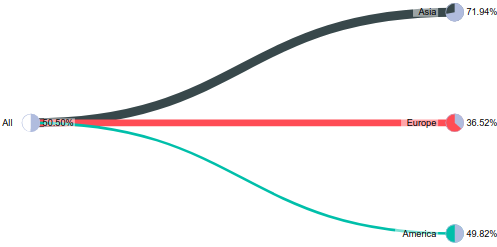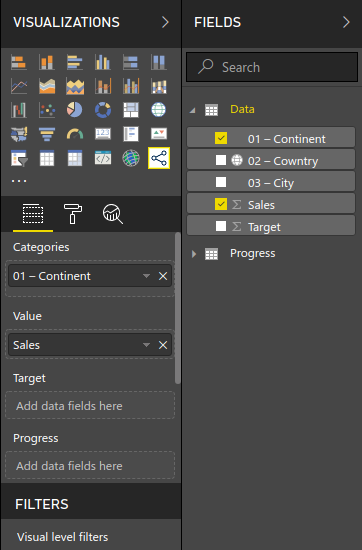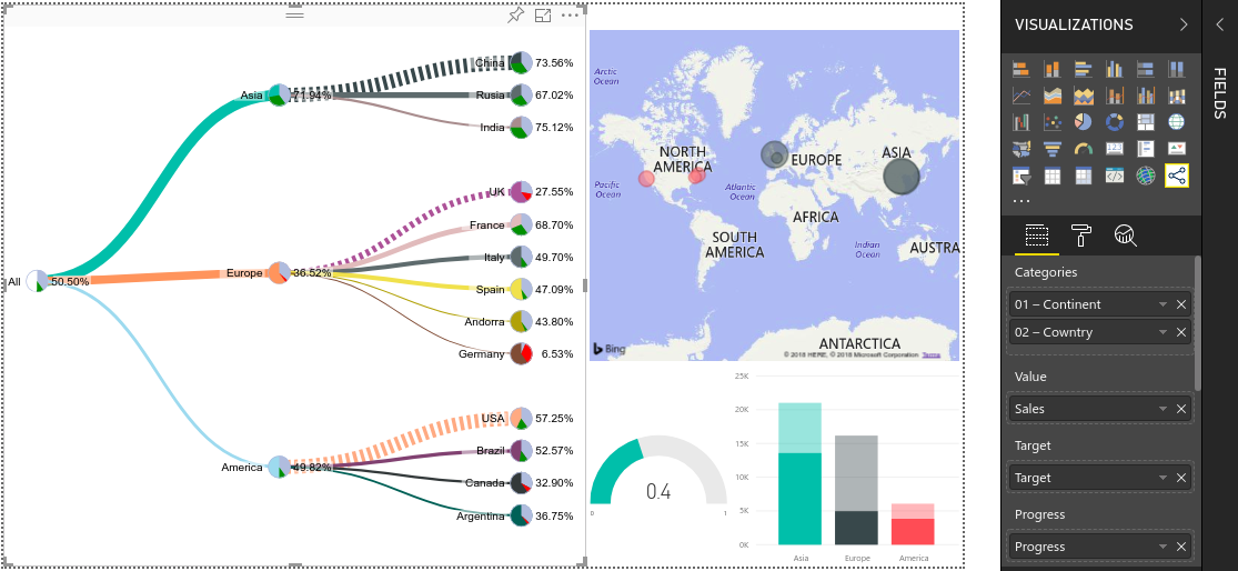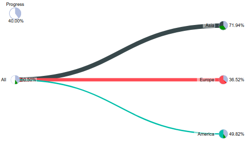 When you select one or more attributes for Categories field, a measure into Value field, a measure into Target field and a measure into Progress field. The pies of the tree shows the max value between progress and value/target. The pie will have 2 slices. The first slice goes from 0 to the min value between progress and value/target. The second slice goes from the end of the first slice to the max value between progress and value/target. The color of this last slice is dinamic depending on difference between progress and value/target.